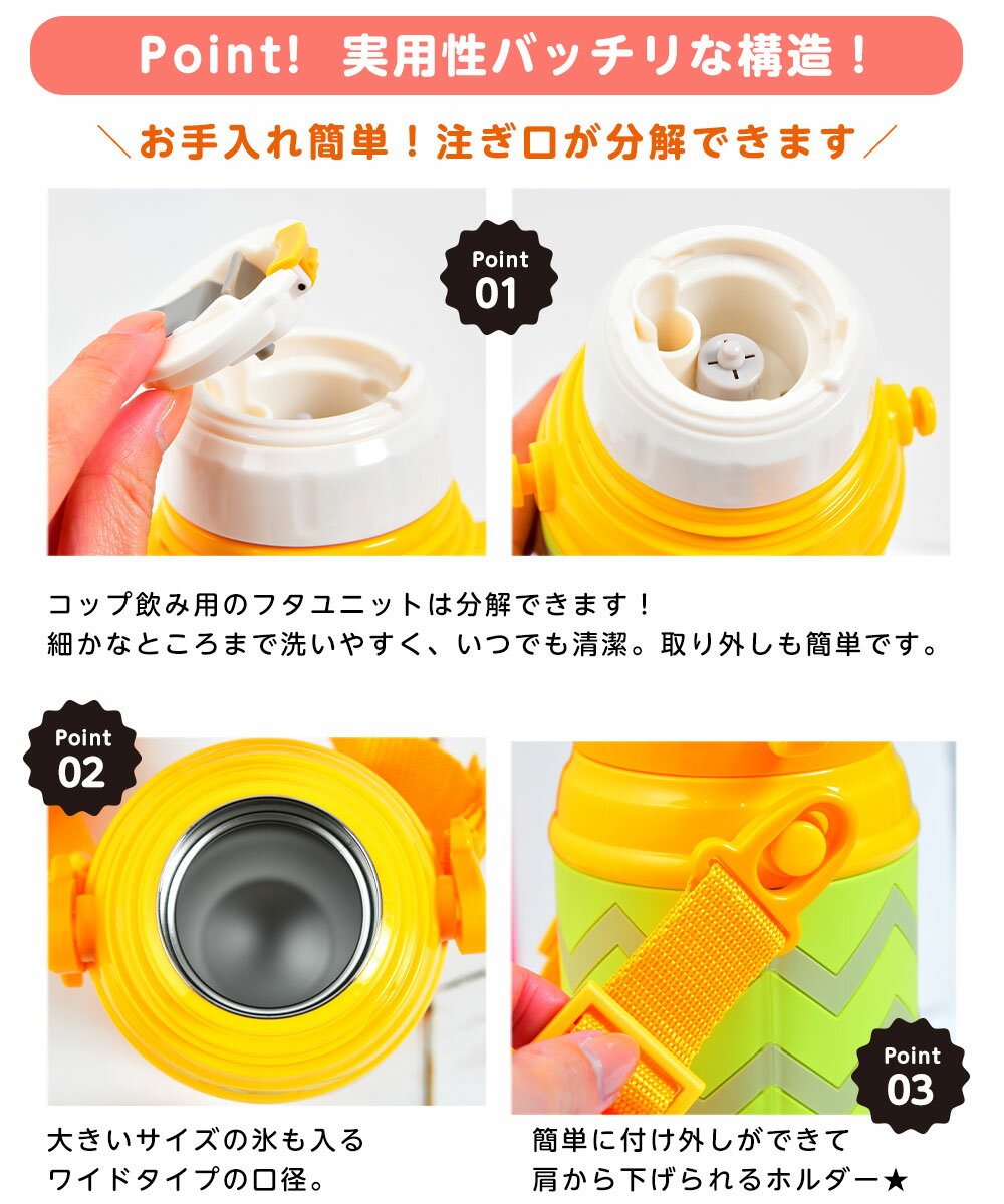 真空2重構造なので、保冷・保温機能もバッチリ!! 保温:72度以上(8時間)コップタイプ 保冷:8度以下(8時間)共通◎注ぎ口はワンタッチで開閉できるので、お子さまでも簡単に注ぐことができます。